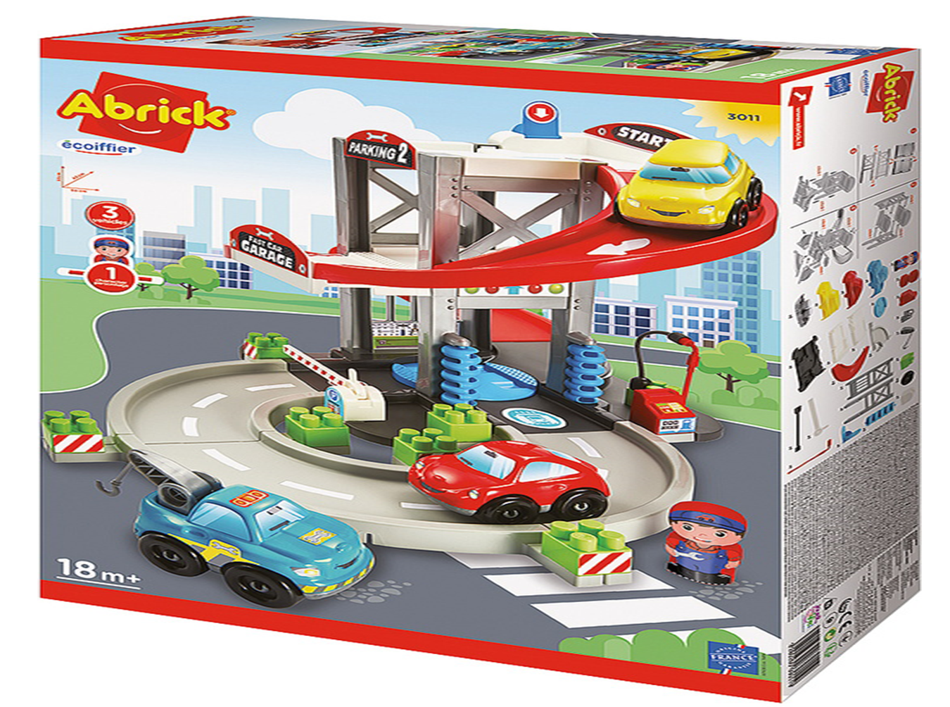 Garage Abrick : garage à deux étages équipé d'un personnage, d'un lanceur, d'une plaque tournante, d'une station de lavage, d'une pompe à essence et dun circuit circulaire pour les deux voitures et la dépanneuse incluses.