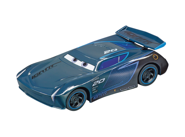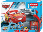 Coffret Carrera First! sous licence Disney, incluant une piste de 2,4 mètres à l'échelle 1/50, deux voitures Flash McQueen et Jackson Storm.