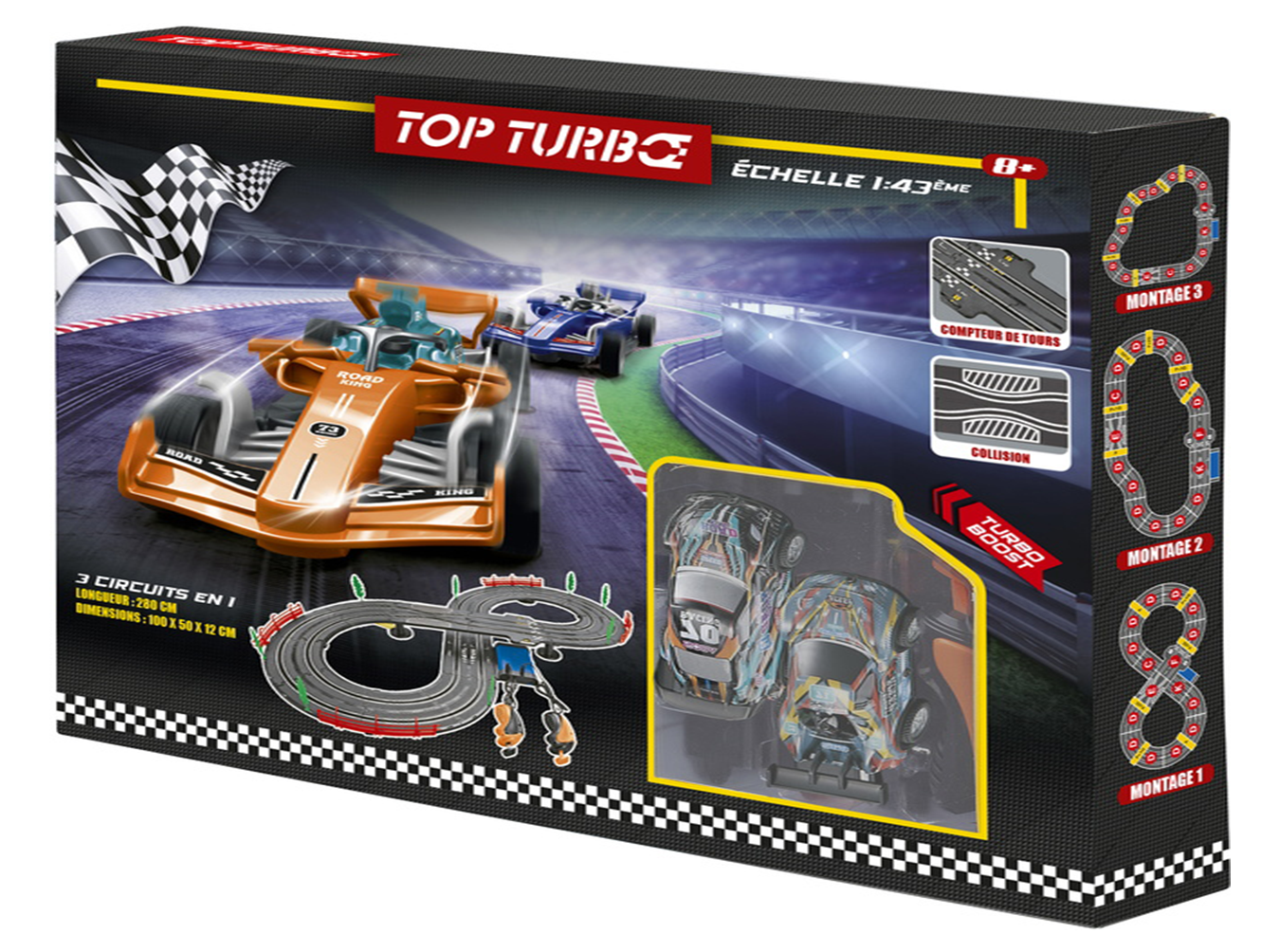 Propulse tes voitures de course sur ce circuit de 2,80 m avec compteur de tours. 44 pièces dont 2 voitures.
