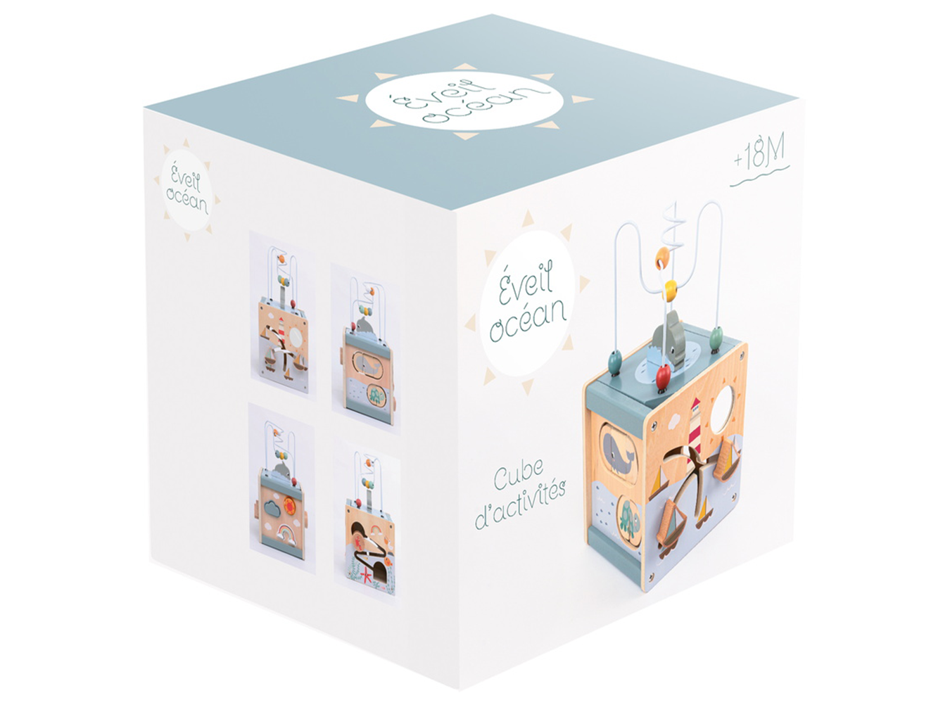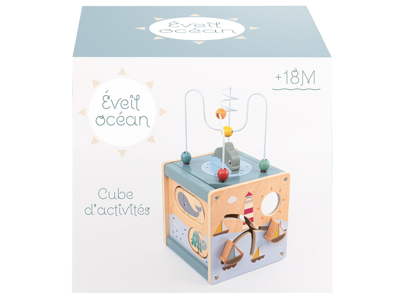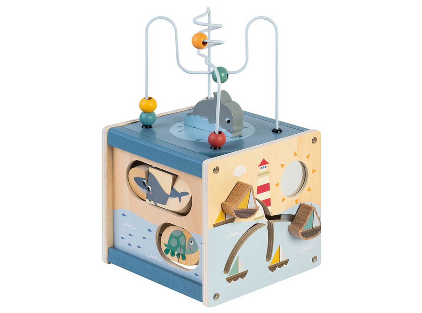 Cube en bois multi Activités Bouliers, formes géométriques, labyrinthe, miroir et engrenages. 18 cm.