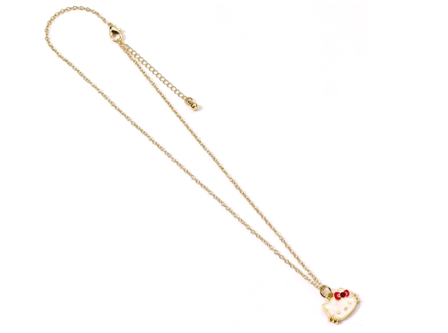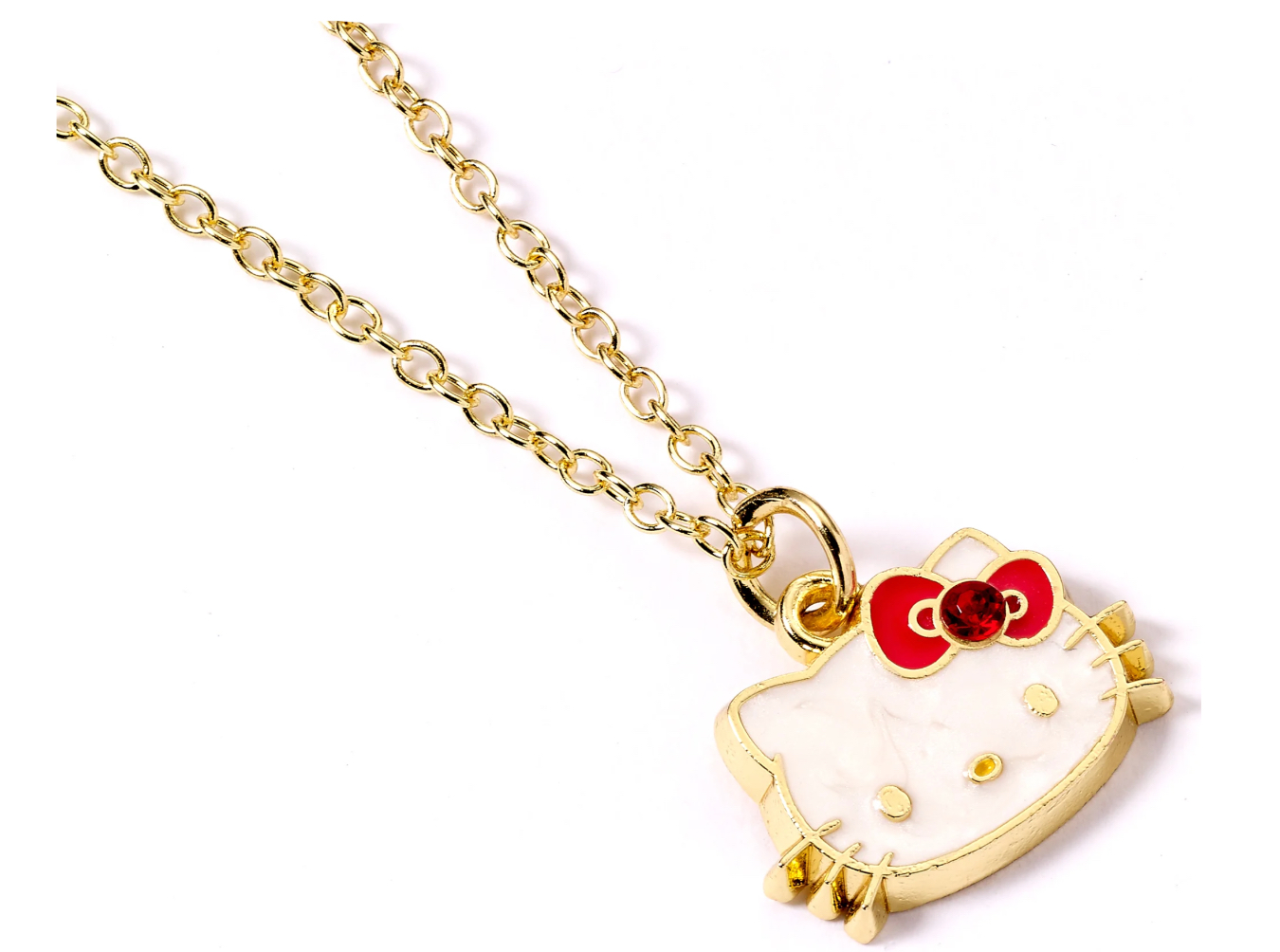 Amusez-vous à porter ce charmant pendentif Hello Kitty en métal doré, orné d'émail et de cristaux étincelants.
