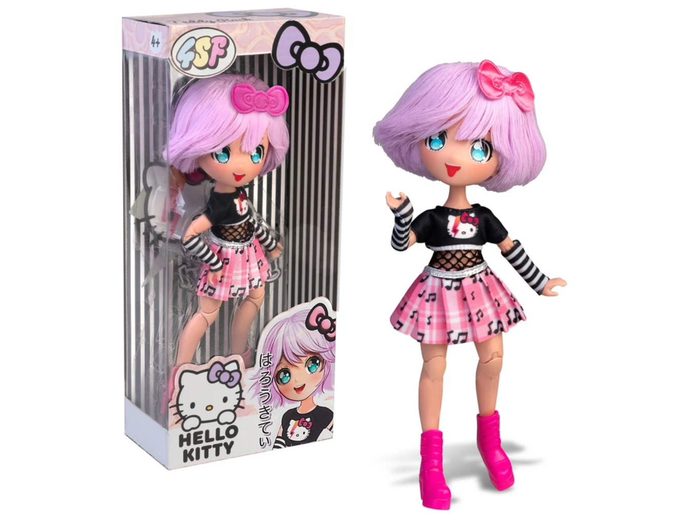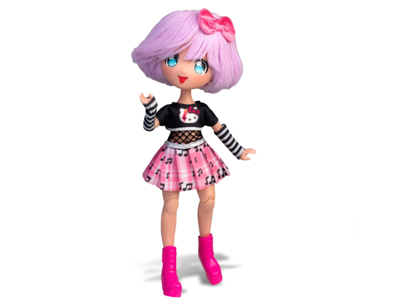 Découvrez votre nouvelle poupée Hello Kitty Teddy Rock. Avec ses magnifiques cheveux blonds et deux mèches roses, elle attire tous les regards.