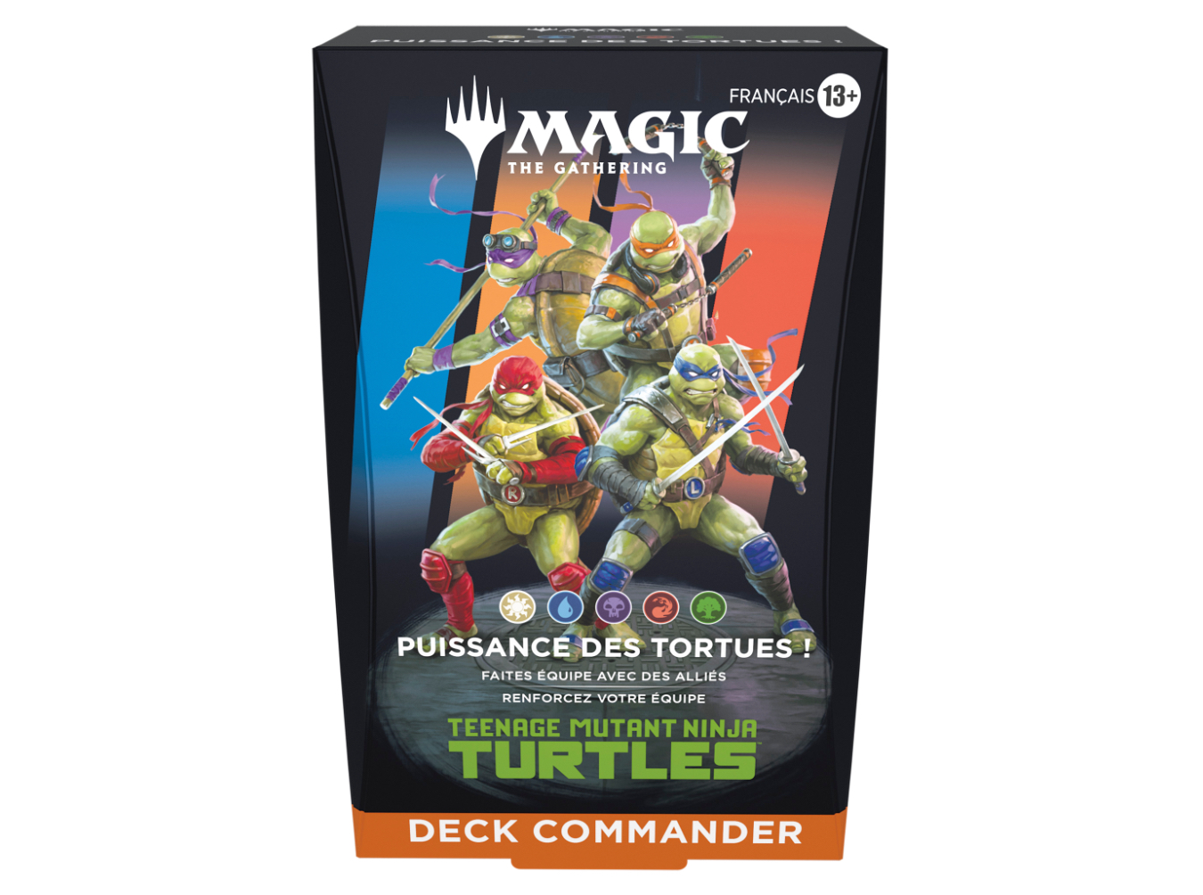 Toute la puissance des Tortues ! Le deck Commander Magic: The Gathering | Teenage Mutant Ninja Turtles contient un deck de 100 cartes avec 43 nouvelles cartes, une boîte de deck, 10 cartes de jeton recto-verso, 1 feuillet de stratégie, 1 fiche de référence.