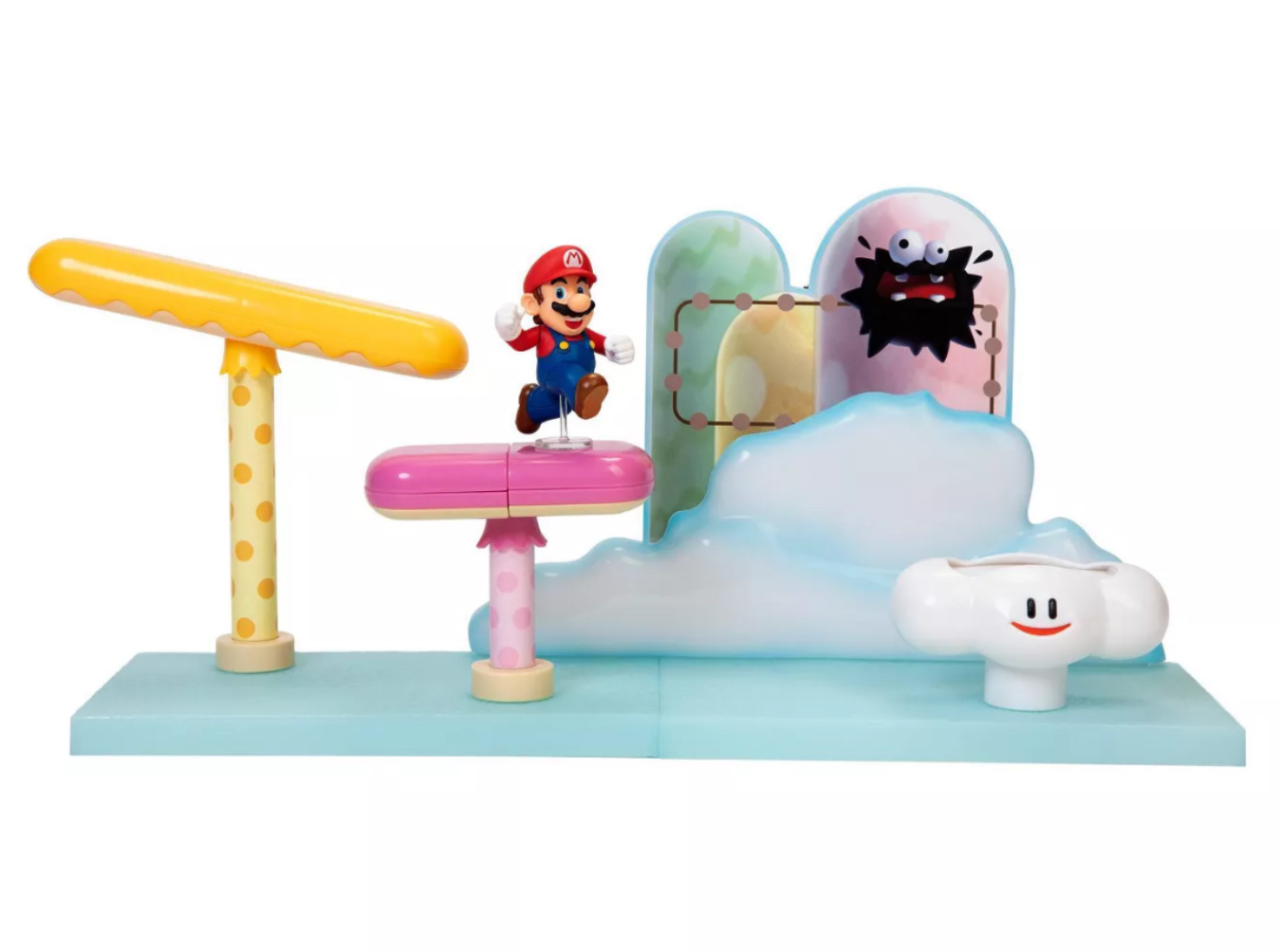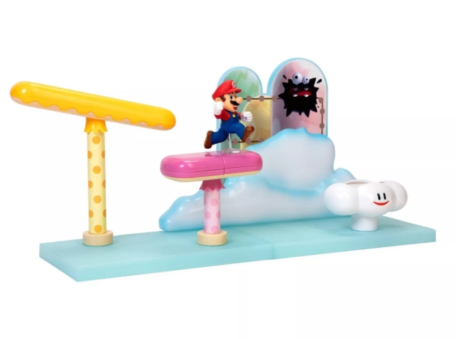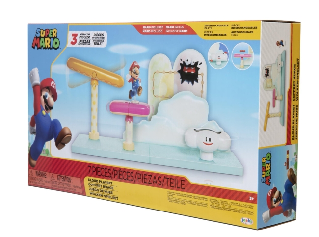 La boîte de jeu Cloud vous permet de rejouer ce niveau classique des jeux vidéo Super Mario™. Vous pouvez recréer le jeu à l'aide de la figurine de Mario de 6,4 cm incluse en le faisant naviguer à travers divers obstacles. Ce set de jeu comprend trois pièces d'environnement interactives avec des mécanismes qui fonctionnent. Vous pouvez même changer la scène en déplaçant le nuage interchangeable, la plateforme à bascule et le plateau extensible/rétractable à votre guise.