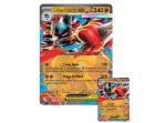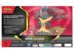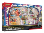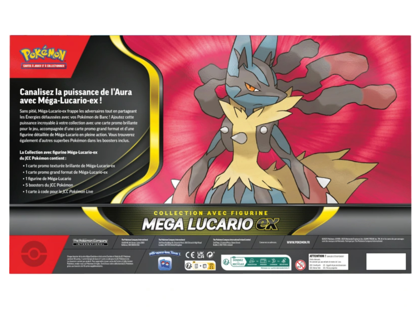 Contenu : 1x carte promo texturée brillante de Méga-Lucario-ex, 1x carte promo grand format de Méga-Lucario-ex, 1x figurine de Méga-Lucario, 5x boosters du JCC Pokémon, 1x carte à code pour le JCC Pokémon Live