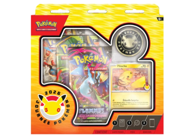 Fêtez l’occasion avec une carte promo brillante spécialement estampillée de Pikachu et une pièce métallique marquée d’un logo spécial, plus trois boosters provenant de diverses extensions du JCC Pokémon.