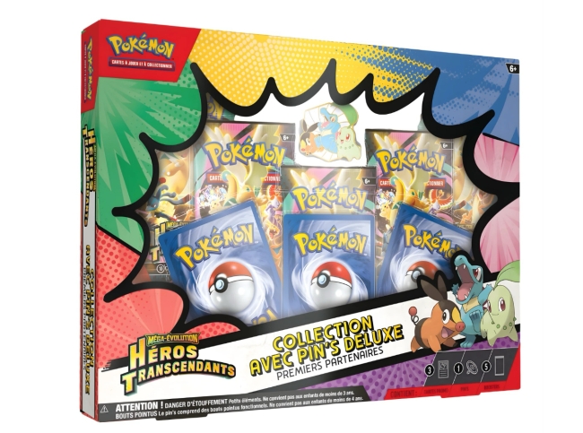 La Collection avec pin’s Deluxe Premiers Partenaires Méga-Évolution – Héros Transcendants du JCC Pokémon contient :