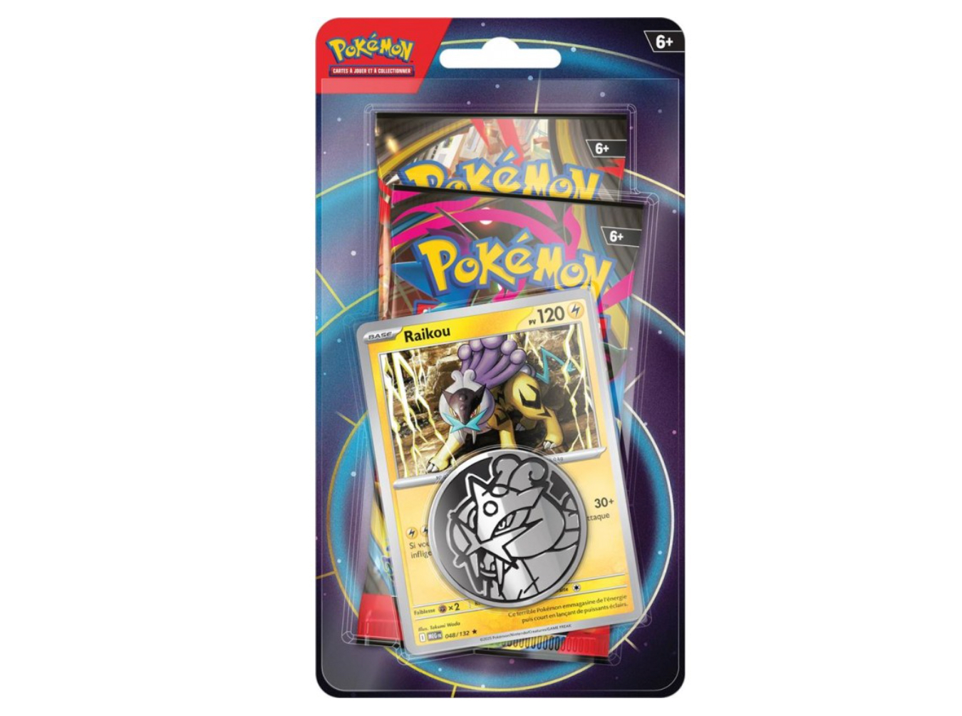 Inclut 1 carte promo Raikou, 1 pièce à jouer Raikou et 2 boosters : 1 Aventures Ensemble + 1 Flammes Fantasmagoriques.