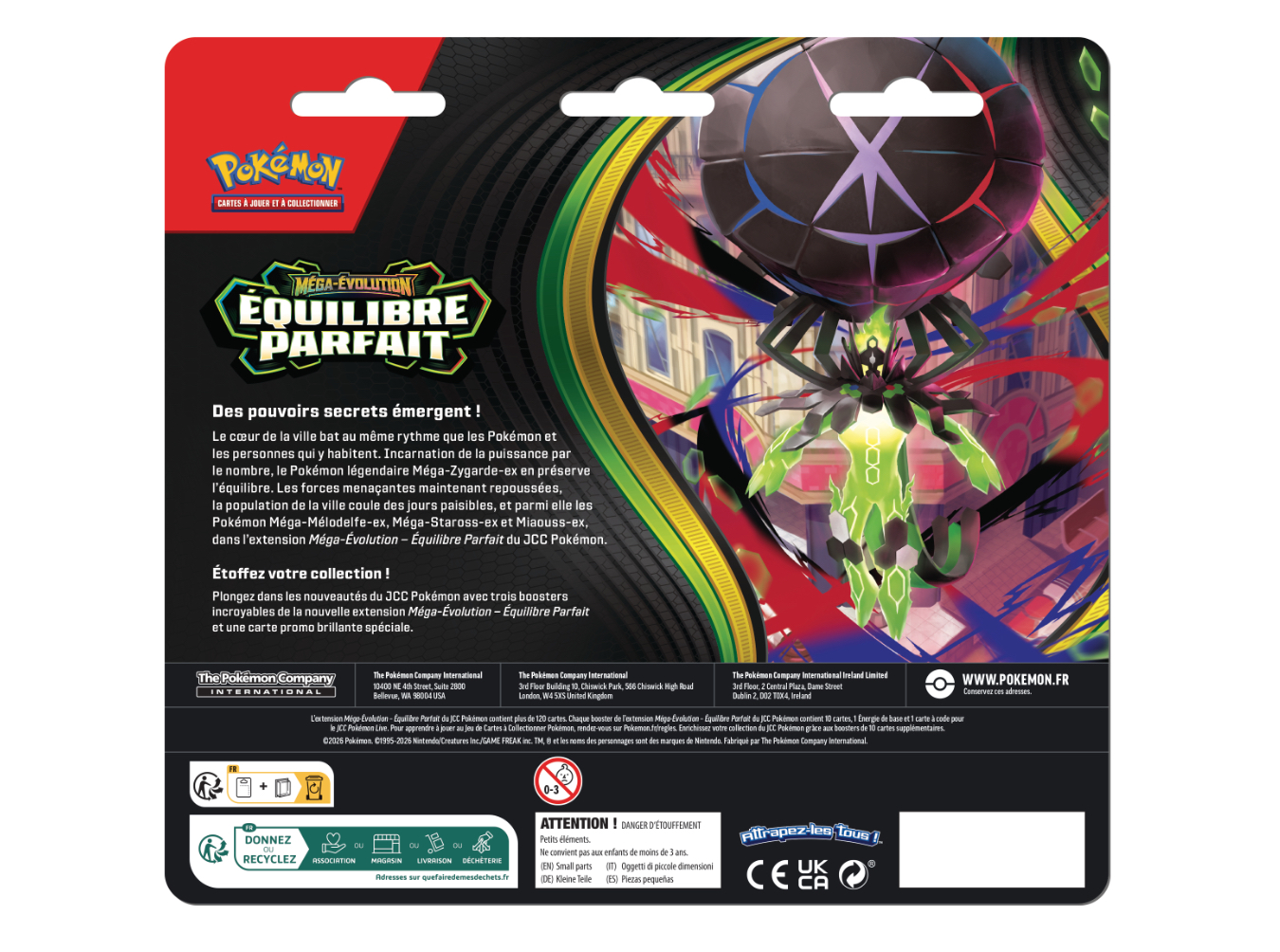 Le cœur de la ville bat au même rythme que les Pokémon et les personnes qui y habitent. Incarnation de la puissance par le nombre, le Pokémon légendaire Méga-Zygarde-ex en préserve l’équilibre. Les forces menaçantes maintenant repoussées, la population de la ville coule des jours paisibles, et parmi elle les Pokémon Méga-Mélodelfe-ex, Méga-Staross-ex et Miaouss-ex, dans l’extension Méga-Évolution – Équilibre Parfait du JCC Pokémon.