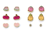 Les clous en métal doré affichent une délicieuse série de fruits, un cœur et des clous en cristal bleu.